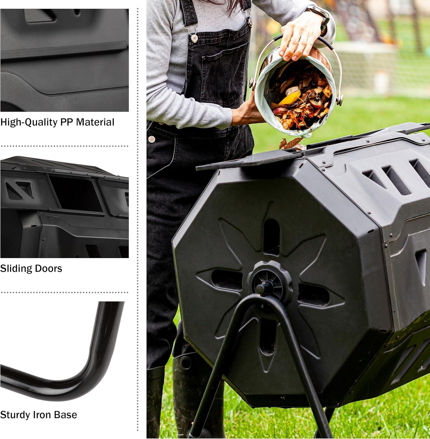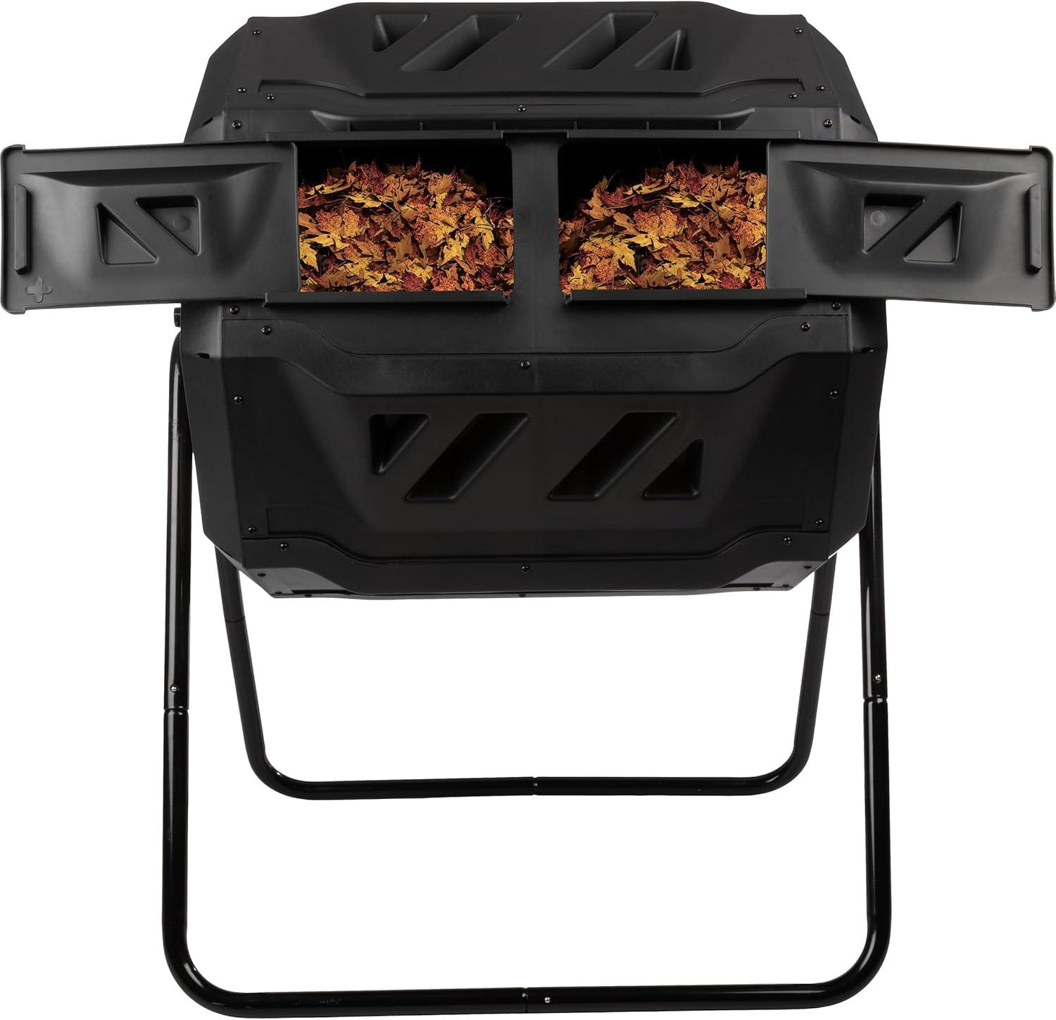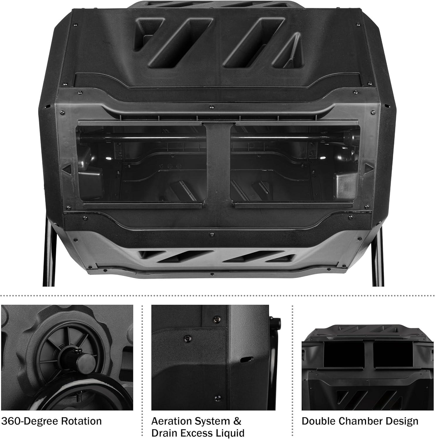 DUAL CHAMBERS – The 2-chamber compost machine offers a constant supply of rich compost as one side allows you to add food scraps and yard debris while the other side cures. The air vents provide excellent aeration, ideal for reducing internal pressure.